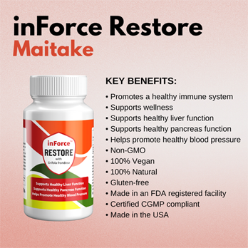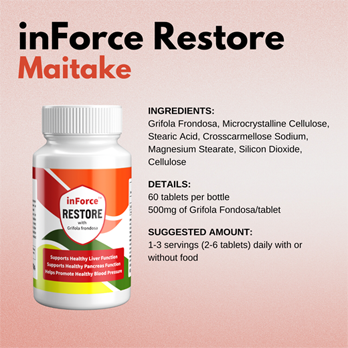 inForce Restore is a dietary supplement made up of the most potent strain of Grifola frondosa (more commonly known as Maitake) to help support the body’s liver and pancreas function. It is also helpful in supporting the body’s blood pressure function. It is a proprietary blend and offers the best value for the money. inForce Restore offers much needed support, and it can be taken on a daily basis. This product is 100% vegan, non-GMO, gluten free, and bottled in the United States in a FDA registered bottling facility that is CGMP compliant (Current Good Manufacturing Practices).